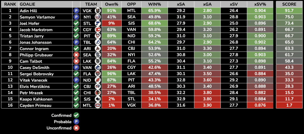 Each day, we will rank the day’s starting goalies based on their Projected Win%, Goals Against Average, and SV%. Win percentage and expected goals against is generated from Sportsbooks Odds and Implied Totals.