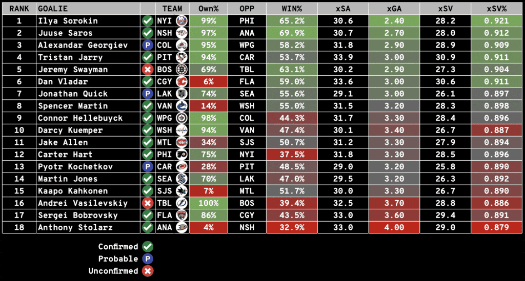 We here at DailyFaceoff try to make being a Fantasy Owner as easy as possible. Each day, we will rank the day’s starting goalies based on their Projected Win%, Goals Against Average, and SV%. Win percentage and expected goals against are generated from Sportsbooks Odds and Implied Totals.