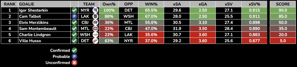 Each day, we will rank the day’s starting goalies based on their Projected Win%, Goals Against Average, and SV%. Win percentage and expected goals against is generated from Sportsbooks Odds and Implied Totals.