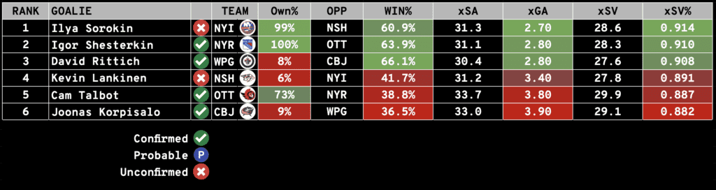 Keep an eye on our Starting Goalies page to ensure the goals listed below are CONFIRMED to start.