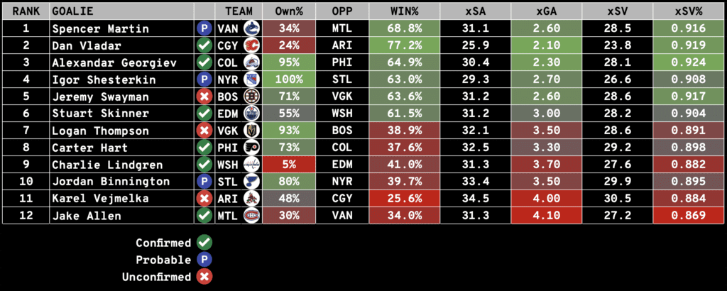 We here at DailyFaceoff try to make being a Fantasy Owner as easy as possible. Each day, we will rank the day’s starting goalies based on their Projected Win%, Goals Against Average, and SV%. Win percentage and expected goals against are generated from Sportsbooks Odds and Implied Totals.
