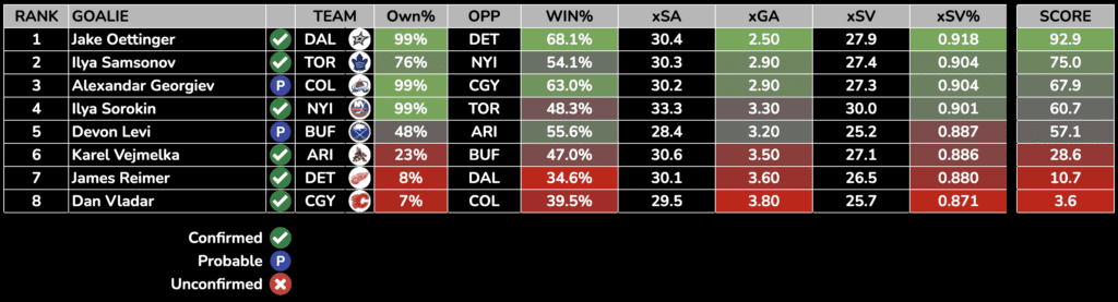 Each day, we will rank the day’s starting goalies based on their Projected Win%, Goals Against Average, and SV%. Win percentage and expected goals against is generated from Sportsbooks Odds and Implied Totals.
