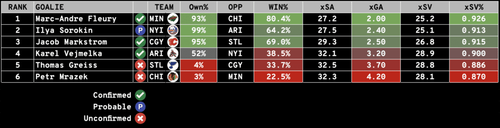 We here at DailyFaceoff try to make being a Fantasy Owner as easy as possible. Each day, we will rank the day’s starting goalies based on their Projected Win%, Goals Against Average, and SV%. Win percentage and expected goals against are generated from Sportsbooks Odds and Implied Totals.