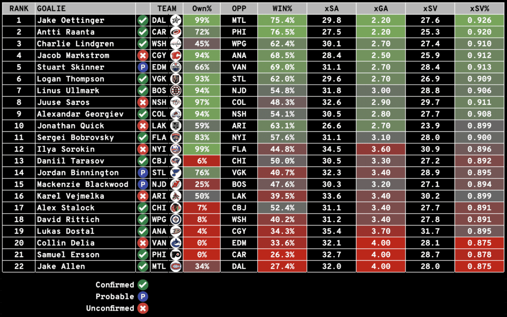 We here at DailyFaceoff try to make being a Fantasy Owner as easy as possible. Each day, we will rank the day’s starting goalies based on their Projected Win%, Goals Against Average, and SV%. Win percentage and expected goals against are generated from Sportsbooks Odds and Implied Totals.
