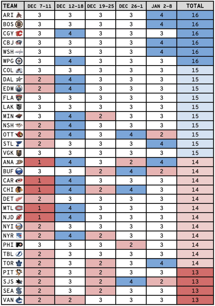 Beniers is one of the best options available in over 50 percent of leagues but has a league-low 13 games during the time MacKinnon will be out. Beniers has caught fire as of late, scoring five goals with seven assists (12 points) in his last eight games. The best sign for Beniers has been the increased shot volume during that stretch. Beniers averaged just 1.7 SOG/gm in his first 17 games but has bumped that up to 2.8 SOG/gm.