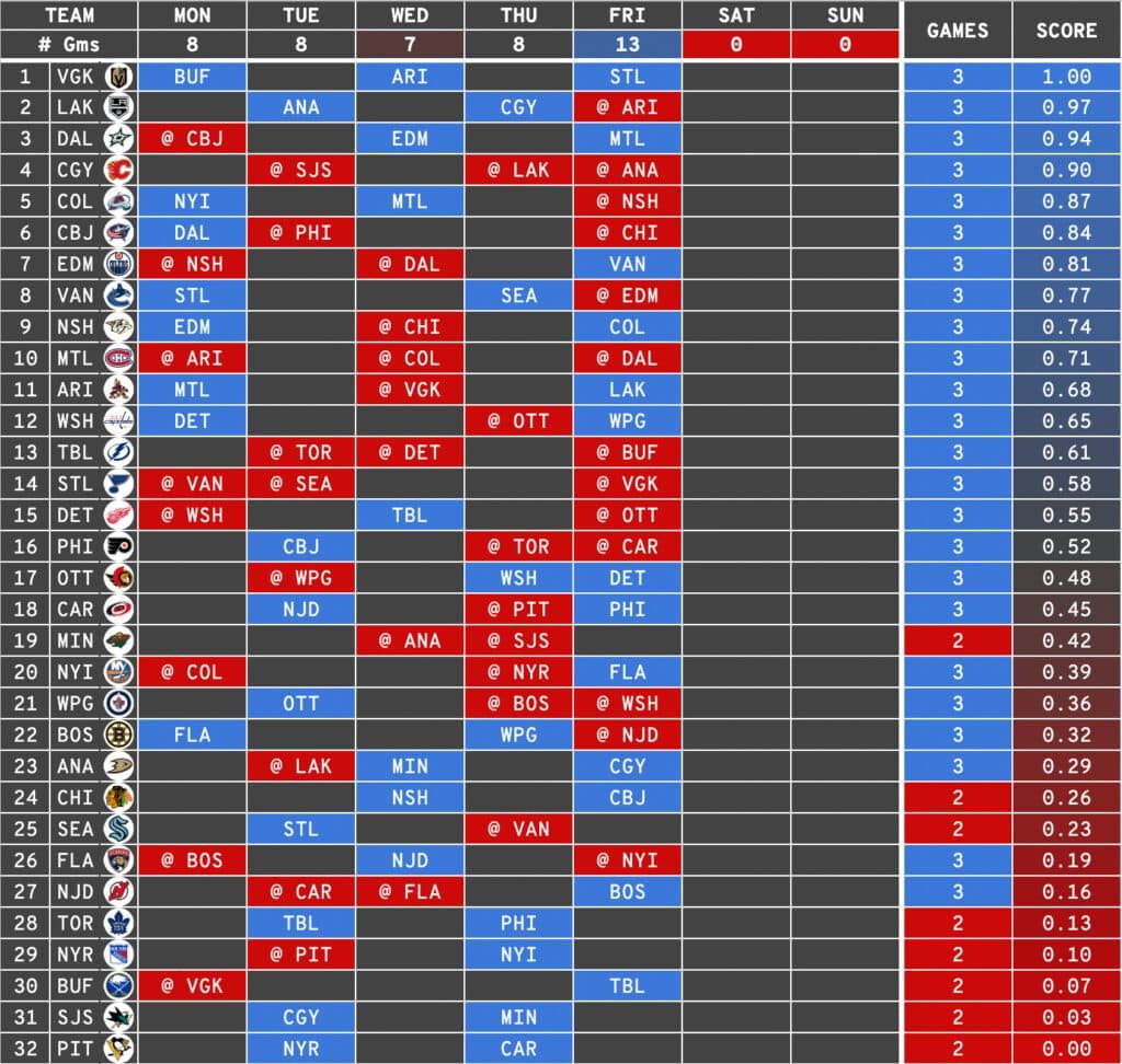 The Golden Knights have the easiest schedule this week, facing the Sabres, Coyotes and Blues, who combine for an average defensive ranking of 27th/32.