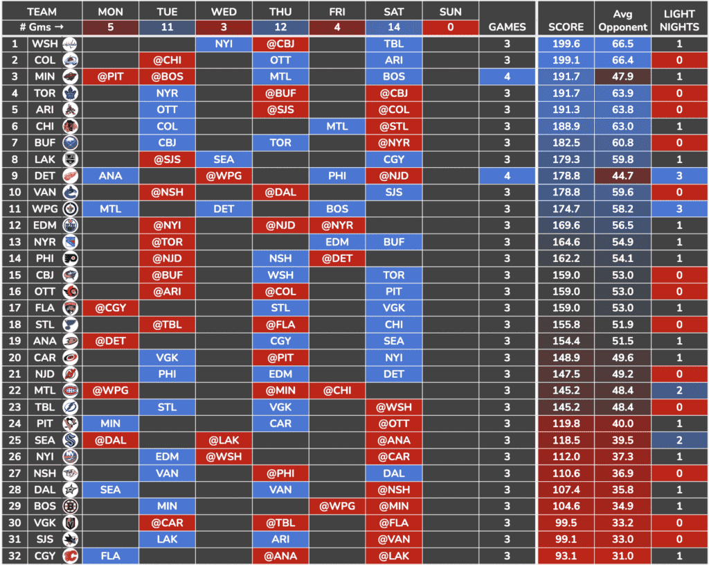 I took that weekly schedule and combined it with a Team Defense Score I created using key defensive metrics to find which teams/skaters have the best schedule this week.