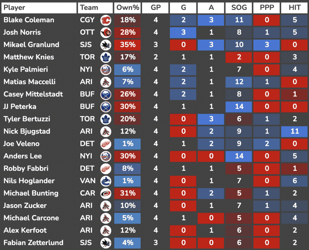 If Ehlers isn’t available in your league, his linemate, Vilardi could be. His own% continues to skyrocket, so hopefully, you picked him up before reading this. Vilardi’s breakout season was halted early on by an injury but he has eight points (4G / 4A) in seven games since returning to the lineup. With Connor out, he’s skating with Scheifele and Ehlers at 5v5 and is also on the top PP unit. He comes into the week red-hot, with six points (3G / 3A) in his last two outings. Like Ehlers, he’s an addition for more than just this week.