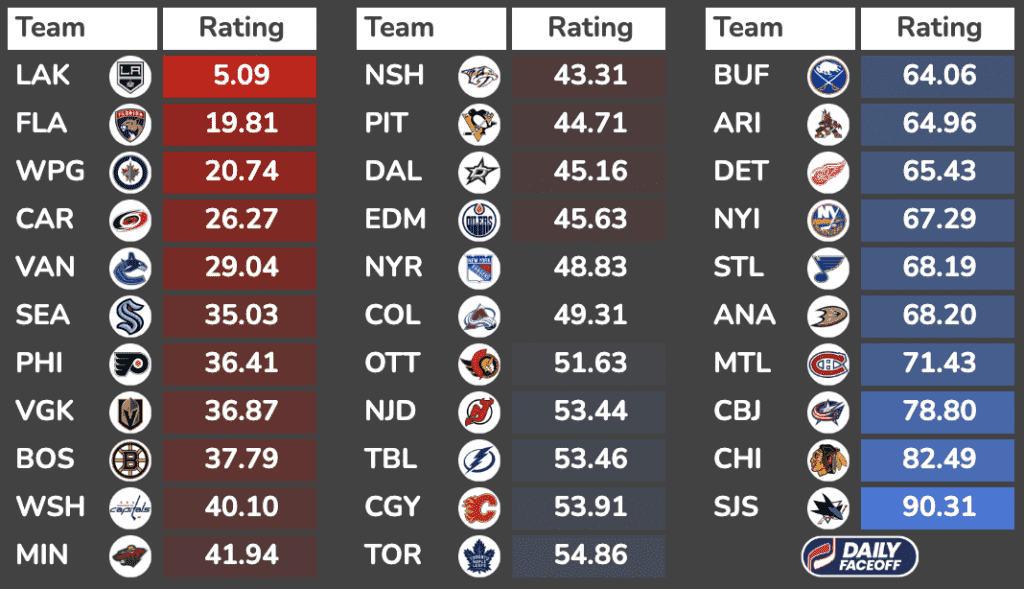 Team Ratings are based solely on defensive metrics and goaltending quality in order to identify the best matchups for skaters. They are in no way a reflection of overall team quality. The lower the rating, the better the team is defensively = worse skater matchup.