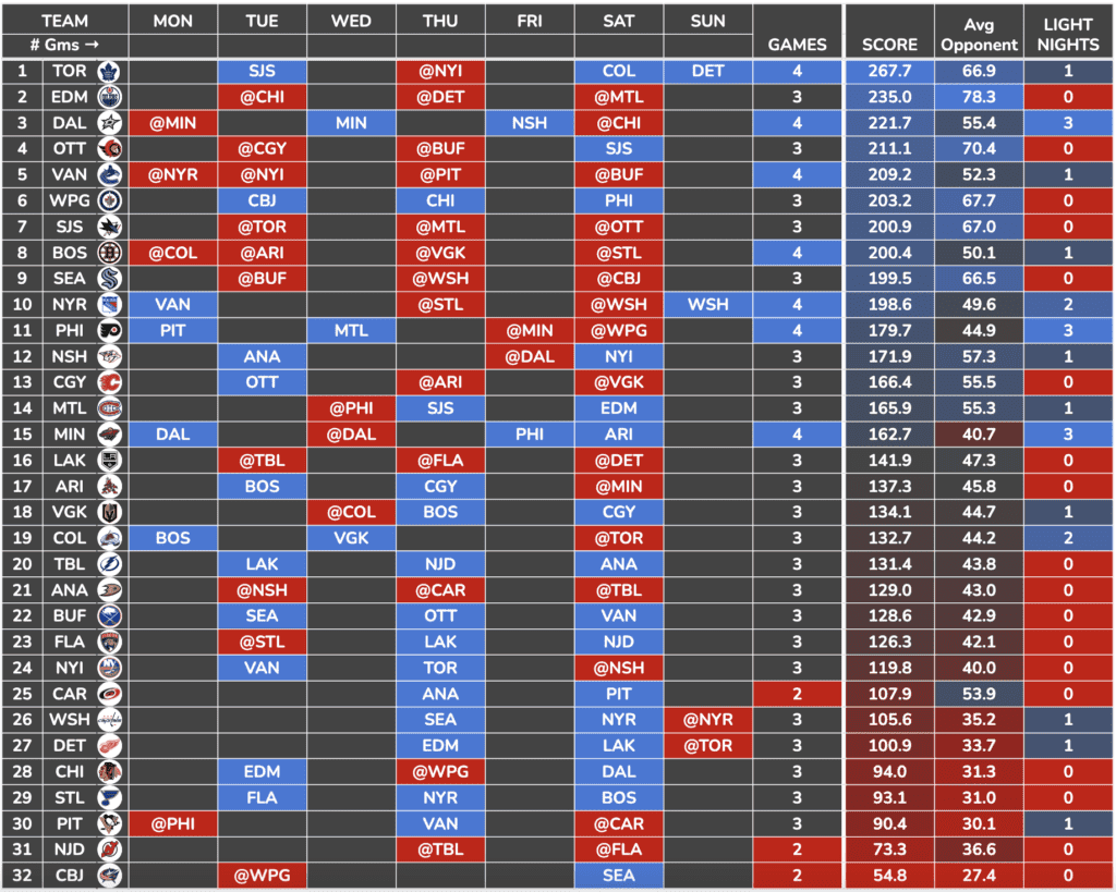 The Maple Leafs have the easiest schedule this week and are one of seven teams with four games. The only knock on the Maple Leafs’ schedule is they only play one game on a light night, which could make them difficult to get into your lineup this week.