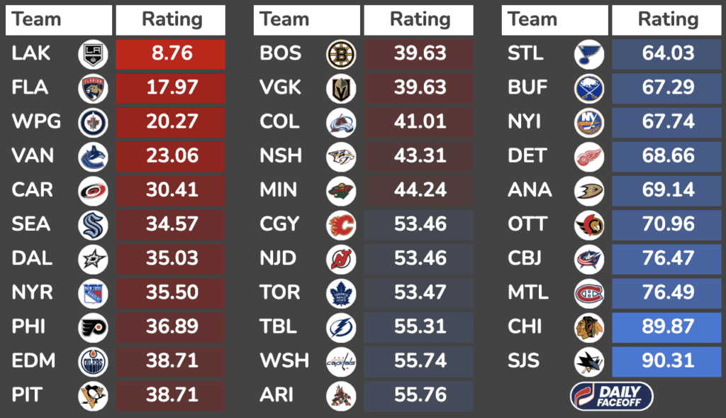 Team Ratings are based solely on defensive metrics and goaltending quality in order to identify the best matchups for skaters. They are in no way a reflection of overall team quality. The lower the rating, the better the team is defensively = worse skater matchup.