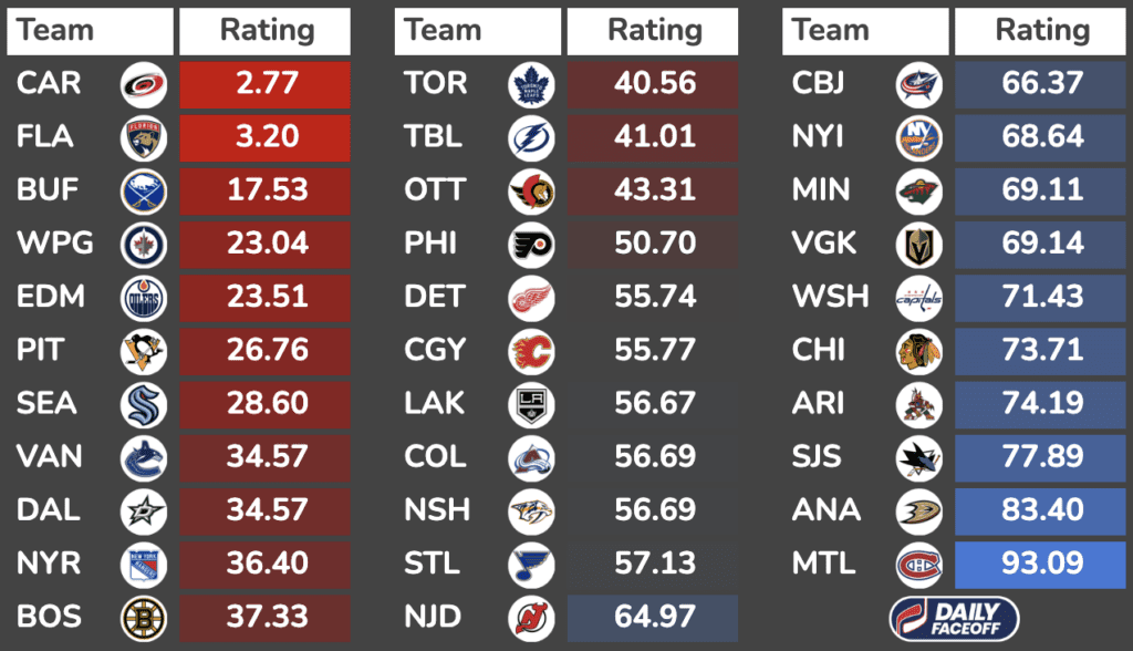 Team Ratings are based solely on defensive metrics and goaltending quality in order to identify the best matchups for skaters. They are in no way a reflection of overall team quality. The lower the rating, the better the team is defensively = worse skater matchup.