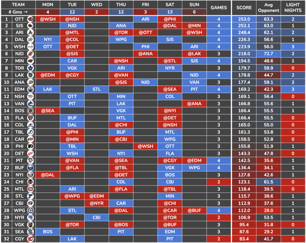 The Senators have the best schedule this week, including two games on ‘Light Nights.’ Their offence has been solid as of late as well, averaging 3.5 goals per game over their last 10 games. They also have a bunch of different streaming targets to choose from.