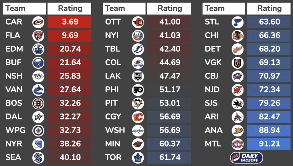 Team Ratings are based solely on defensive metrics and goaltending quality in order to identify the best matchups for skaters. They are in no way a reflection of overall team quality. The lower the rating, the better the team is defensively = worse skater matchup.
