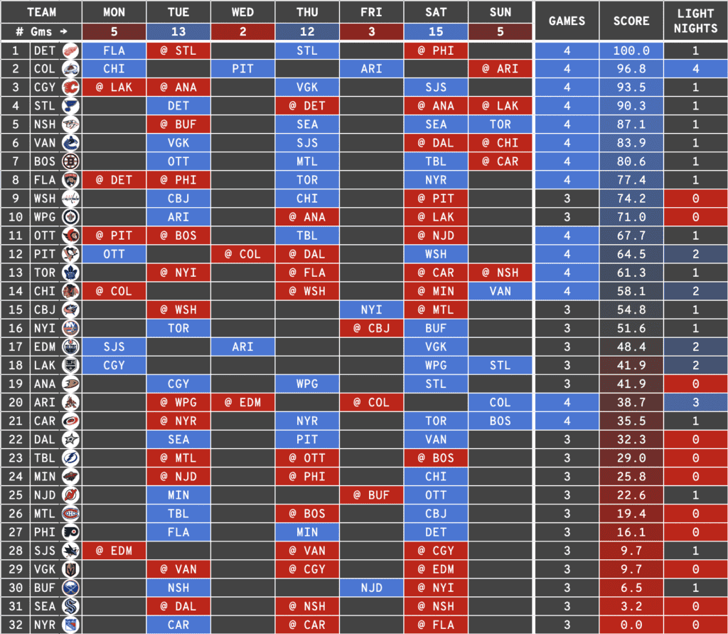 In a crucial week in Fantasy Hockey, the Avalanche have the perfect streaming schedule, playing games on Monday, Wednesday, Friday, and Sunday. Their week is also loaded with good matchups, giving them the second-easiest schedule.
