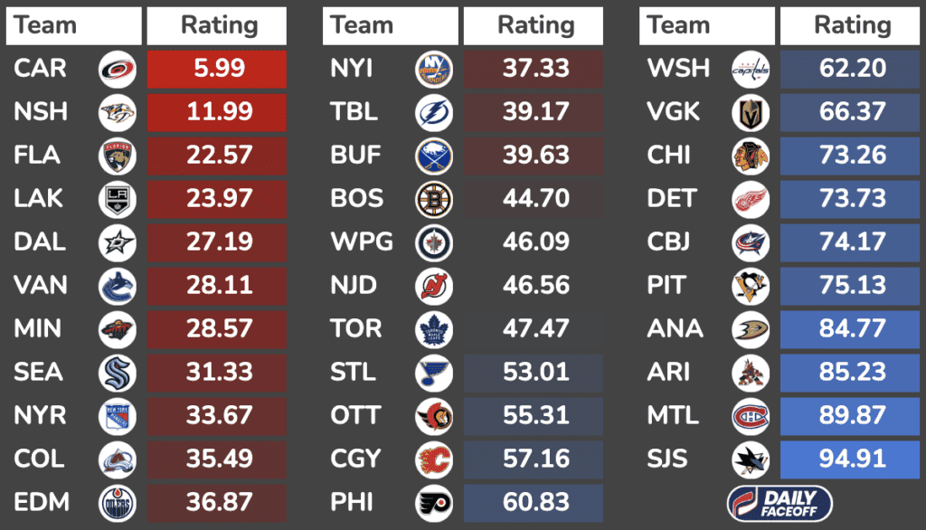 Team Ratings are based solely on defensive metrics and goaltending quality in order to identify the best matchups for skaters. They are in no way a reflection of overall team quality. The lower the rating, the better the team is defensively = worse skater matchup.