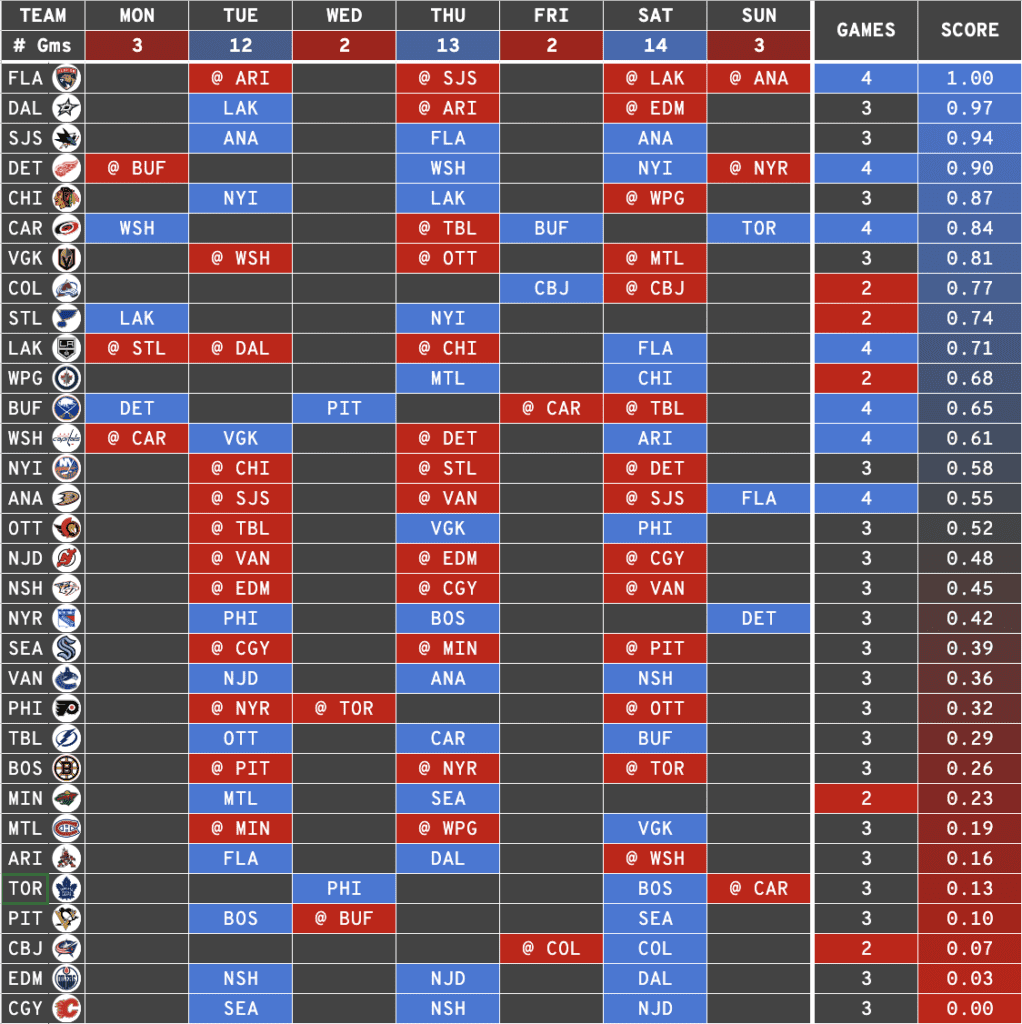 I took that weekly schedule and combined it with a Team Defense Score I created using key defensive metrics to find which teams/skaters have the easiest schedule this week.