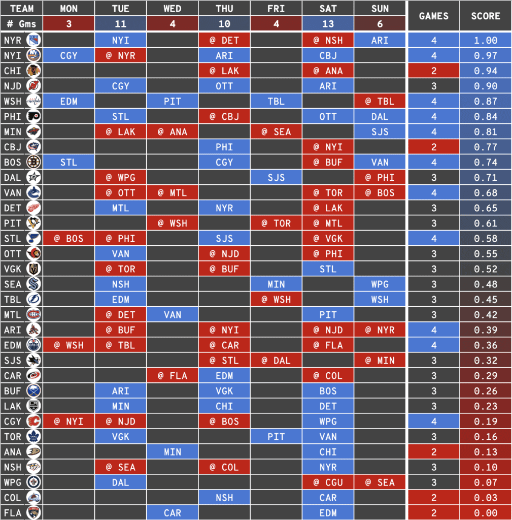 I took that weekly schedule and combined it with a Team Defense Score I created using key defensive metrics to find which teams/skaters have the easiest schedule this week.