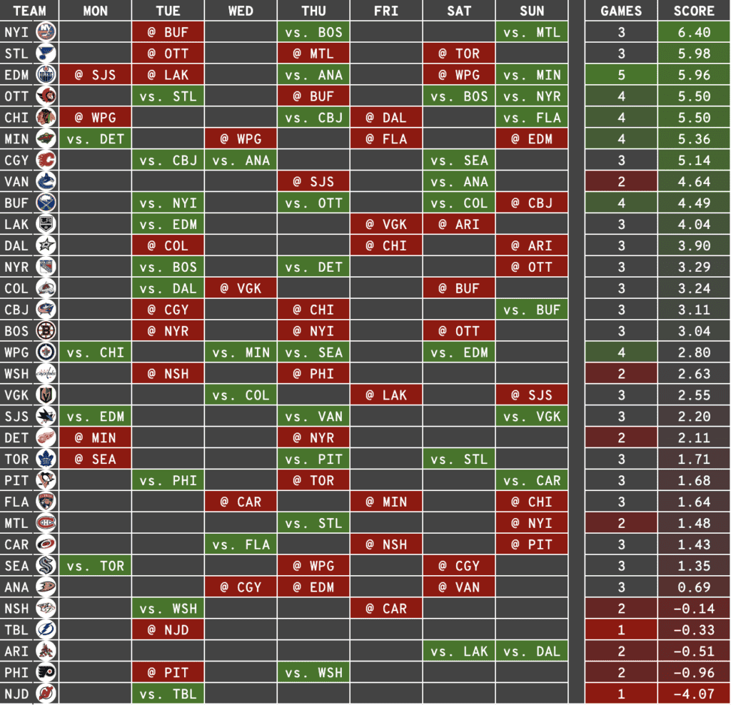 I took that weekly schedule and combined it with a Team Defense Score I created using key defensive metrics to find the teams/skaters with the best schedule for fantasy hockey this week.