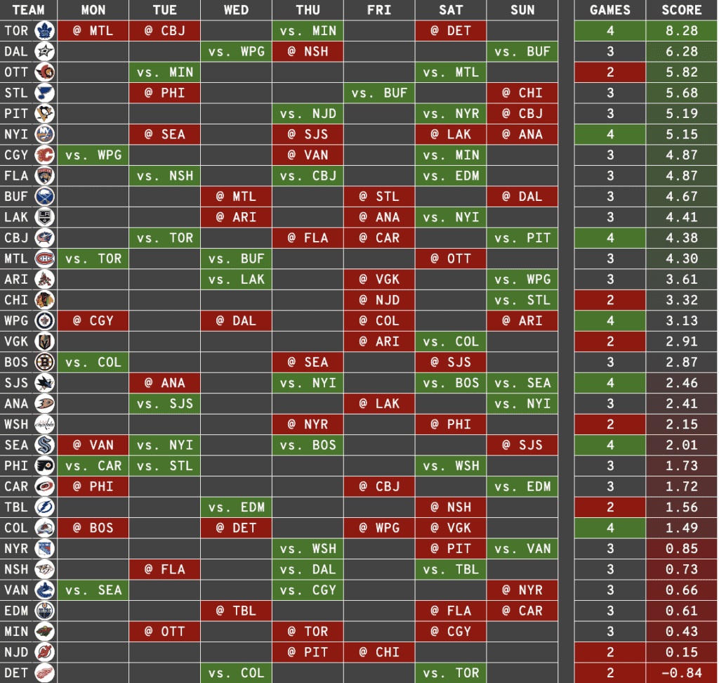 I took that weekly schedule and combined it with a Team Defense Score I created using key defensive metrics to find the teams/skaters with the best schedule for fantasy hockey this week.