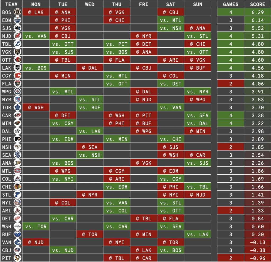 The Bruins are in the middle of a six-game road trip and have four games this week. While their week starts off with a fairly difficult matchup in Los Angeles, games in Anaheim, Vegas, and Columbus give them the best schedule of the week.