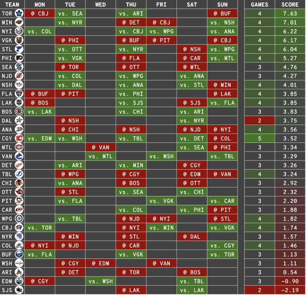 I took that weekly schedule and combined it with a Team Defense Score I created using key defensive metrics to find the teams/skaters with the best schedule for fantasy hockey this week.