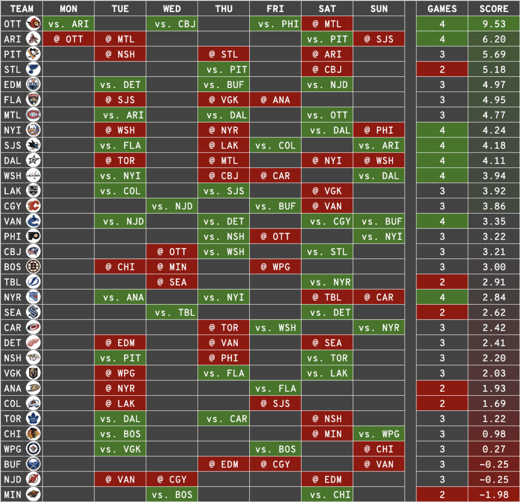 I took that weekly schedule and combined it with a Team Defense Score I created using key defensive metrics to find the teams/skaters with the best schedule for fantasy hockey this week.