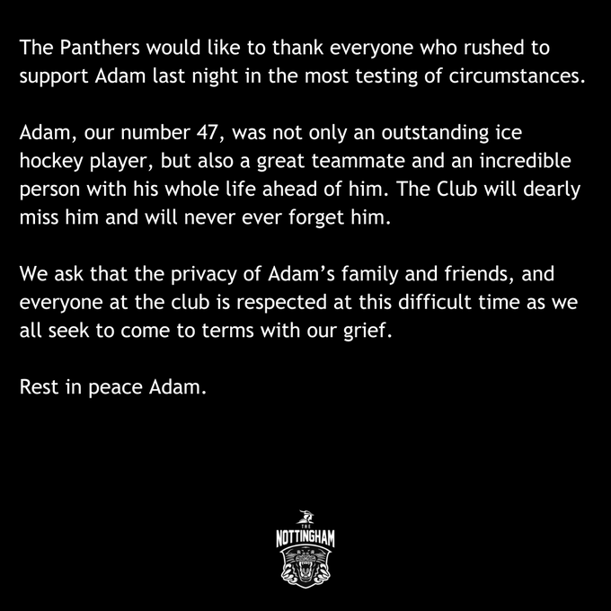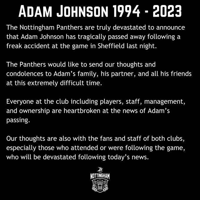 The Nottingham Panthers are truly devastated to announce that Adam Johnson has tragically passed away following a freak accident at the game in Sheffield last night.