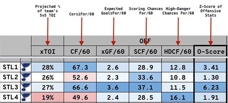 I have key Offensive and Defensive metrics listed for every line on the slate. The metrics are combined into one easy-to-digest number (O-Score). O-Score is a Z-Score for all of the key metrics for all lines on the slate, the higher (Blue) the O-Score the better that line is at producing offence. The lower (Red) the worse they are. The same goes for the Defensive stats (D-Score).