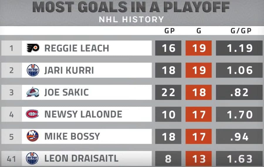 Tyler Yaremchuk: Things are all tied up at 1 between the Edmonton Oilers and Vegas Golden Knights, but before we look ahead to this evening’s game between the two, let’s look back a bit. Through four periods in this series Leon Draisaitl had 6 goals. He already has the 41st most productive postseason ever, and we’re only 8 games into this thing. Draisaitl is 6 away from Reggie Leach at the top. Frank, I’m not asking whether Draisaitl can get the record at some point; I think we need to have a conversation over whether or not he can catch Reggie Leach by the end of this round. The run he’s on is remarkable.