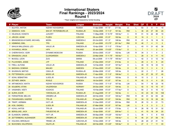 For the European-based skaters, 6-foot-7 defenseman Anton Silayev leads the way in the top spot, with Ivan Demidov, Konsta Helenius, Adam Jiricek and Michael Brandsegg-Nygard rounding out the top five.