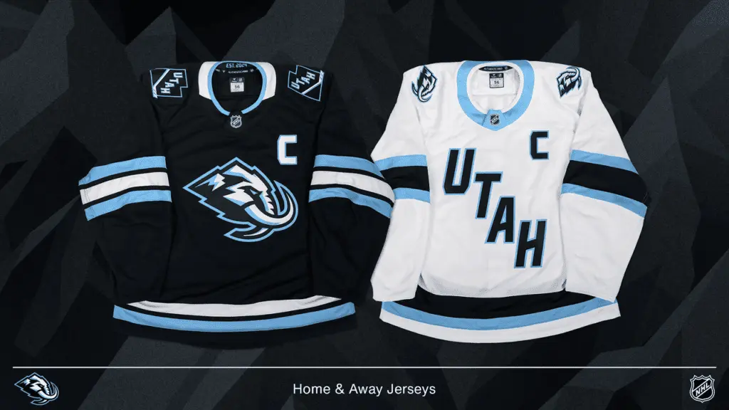 Utah’s inaugural color palette will remain – termed as Black Rock, Salt White and Mountain Blue – along with the original colors and striping from their first-year jerseys. It’s the Mountain Mammoth logo that will adorn the Black Rock home jersey, with U-T-A-H scripted across the Salt White away jersey – so there will be no confusion in visiting arenas about where the Mammoth hail from.
