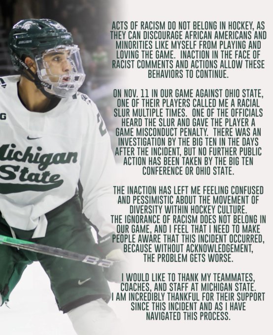 “The inaction has left me feeling confused and pessimistic about the movement of diversity within hockey culture,” Joshua said. “The ignorance of racism does not belong in our game. And I feel that I need to make people aware that this incident occurred, because without acknowledgment, the problem gets worse.”