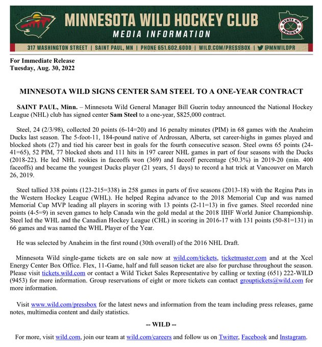 The #mnwild has signed C Sam Steel to a one-year, $825,000 contract. He collected 20 points (6-14=20) in 68 games with Anaheim in 2021-22. Steel set career-highs in GP and blocked shots (27) and tied his career best in goals for the fourth straight season. ow.ly/pisH50Kw1II
