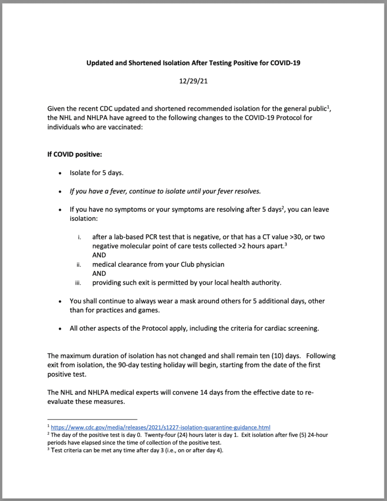 The NHL’s previous protocol called for a 10-day isolation period, but is now in line with new recommendations made by the U.S. Center for Disease Control earlier this week and similar to changes that resulted in the NBA and NFL.