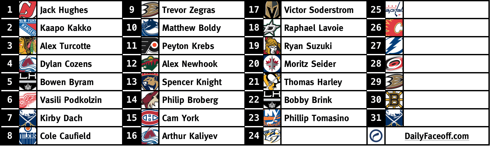 I would love Tomasino at No. 23, with the Isles getting the very last top-end center in the draft and a player who projects as a top-six forward. After going wing and defense heavy in the previous draft, getting a true top center prospect would be important for their farm system. — Corey Pronman (The Athletic)