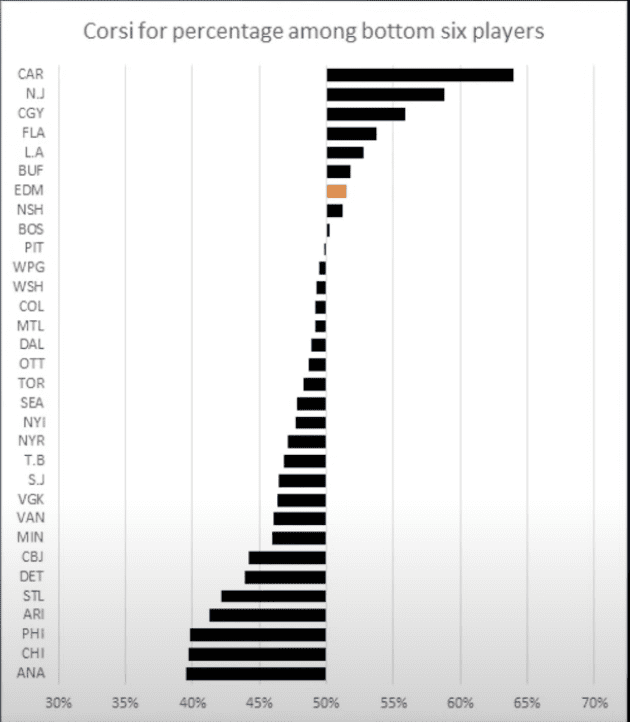 When the team doesn’t have McDavid and Draisaitl on the ice, they’re at 54 percent Corsi this year, compared to 48 percent over the last three years. In this chart here, I’ve looked at Corsi for bottom-six players and the Oilers are seventh-best in the league…