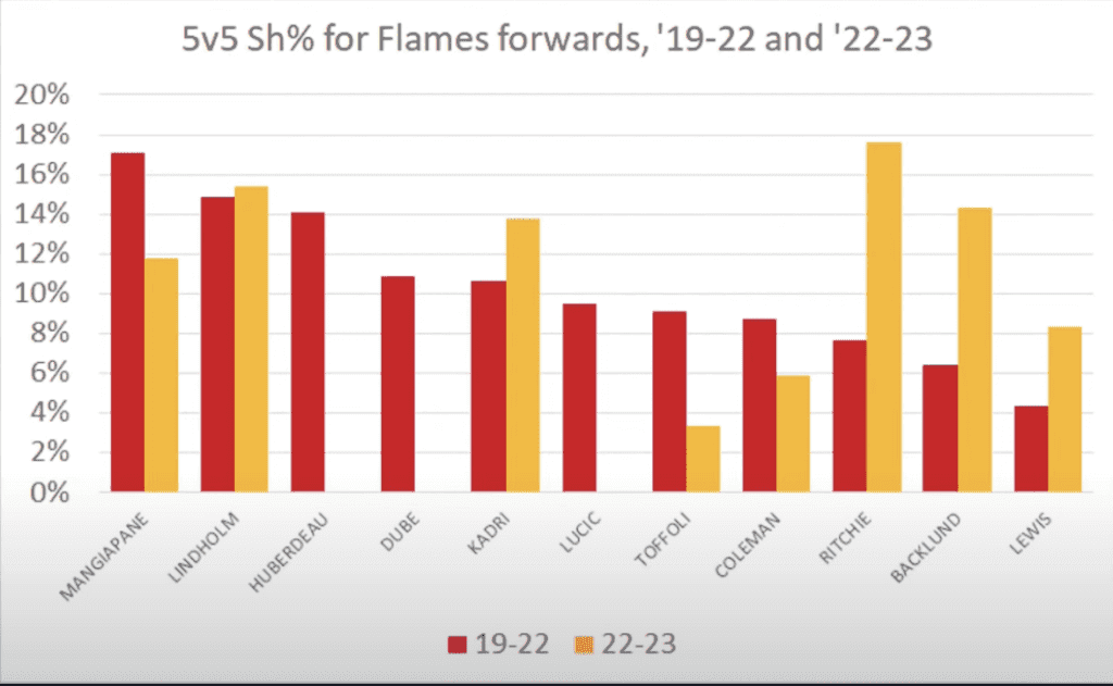 This is a five-on-five shooting percentage chart for Flames forwards. I’m comparing this season to their previous seasons, and we just see this huge dip for so many skilled players.