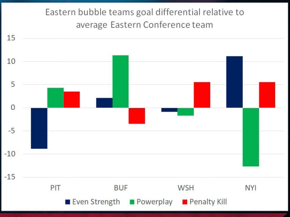 Look at the gap between the Islanders and the rest of the teams in the east fighting for that wildcard spot, they’re just a much better five-on-five team, their penalty kill’s been good, up there with Washington. Their power play is just so bad, it doesn’t really make sense with the pieces that they have. Anders Lee is a very strong net front guy, Matt Barzal is a very strong playmaker, Noah Dobson is a very good power play quarterback at the point. One problem that they have is that Brock Nelson’s shooting this year has completely fallen off, as has Anders Lee’s. They’re taking a lot more shots from players that aren’t as good as taking shots; they have the most shots per 60 from defensemen out of any team in the league. 26 percent of their shots on the power play have come from defensemen, that’s the fifth-most, so it’s a lot of perimeter efforts.