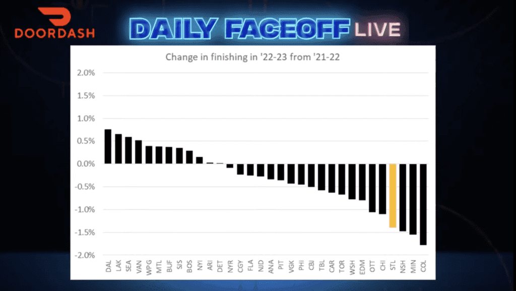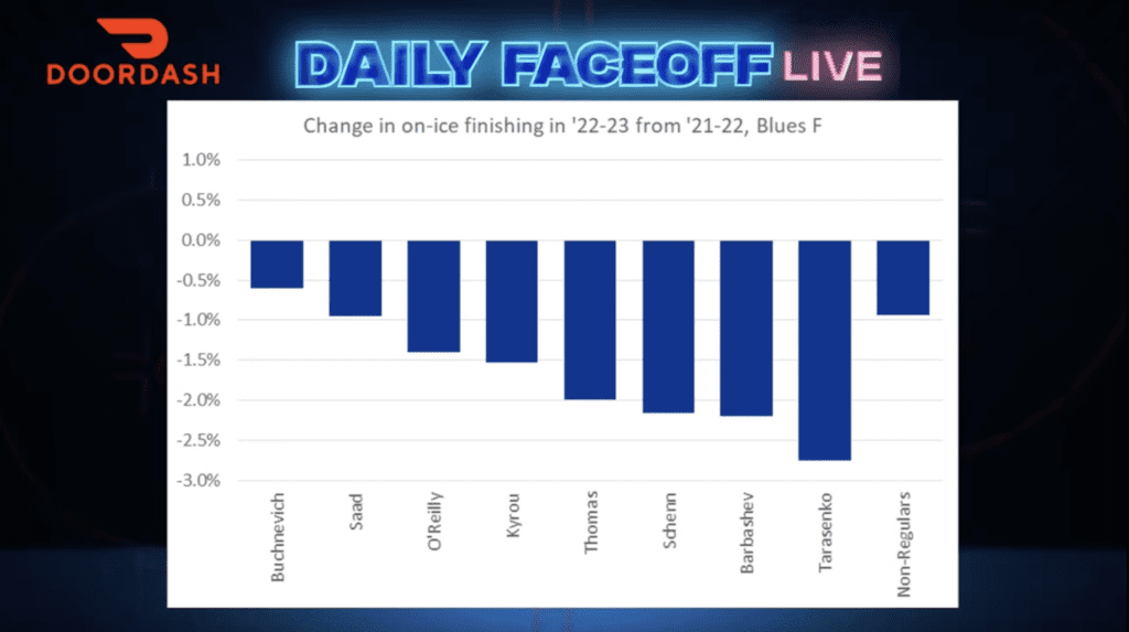 When I watched them, the Blues are finishing a lot worse than they were last season. I’ve looked at finishing as goals for minus expected goals for divided by shots for to see which Blues forwards are causing the drop in production for the team…