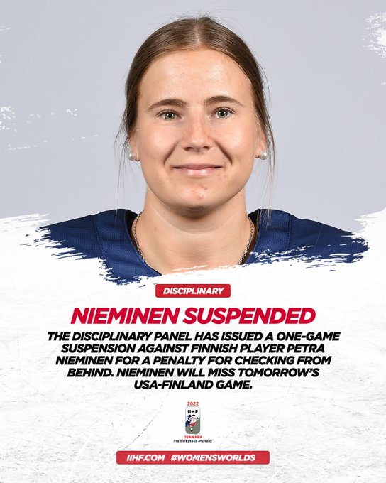 Disciplinary Notice: @leijonat's Petra Nieminen will miss tomorrow's game against @usahockey More: iihf.com/en/events/2022…