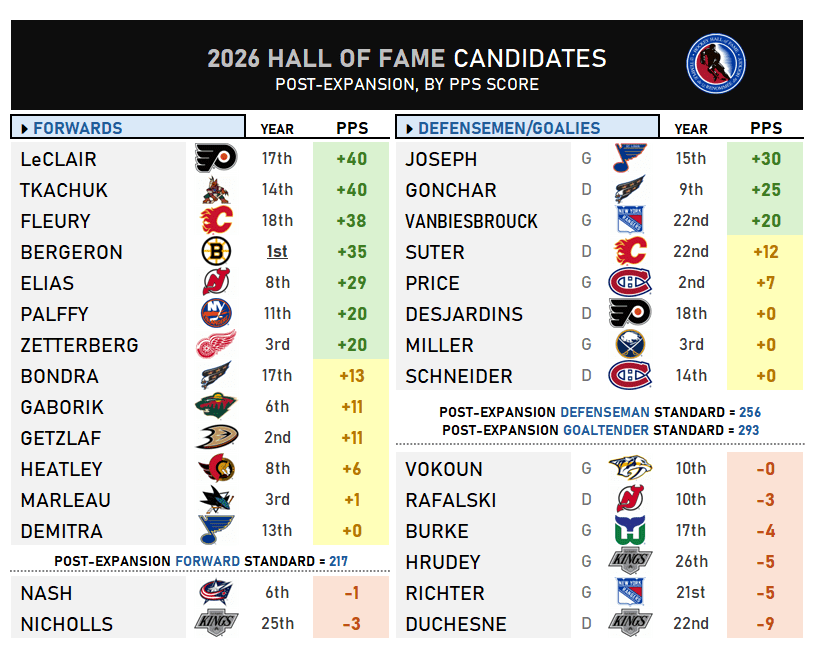 I’m a longtime backer of Gonchar’s candidacy, outlined here in this 2023 piece. He is a brilliant mind and talent whose excellence is lost from playing the Hall’s most under-represented position in the most offensively suppressed era since expansion. Gonchar’s got the highest PPS (281) among eligible blueliners — above recent first-ballot defenders Zdeno Chara (279), Duncan Keith (258), and Shea Weber (257). It’s time to elect Gonchar. This is a perfect year to make it happen.