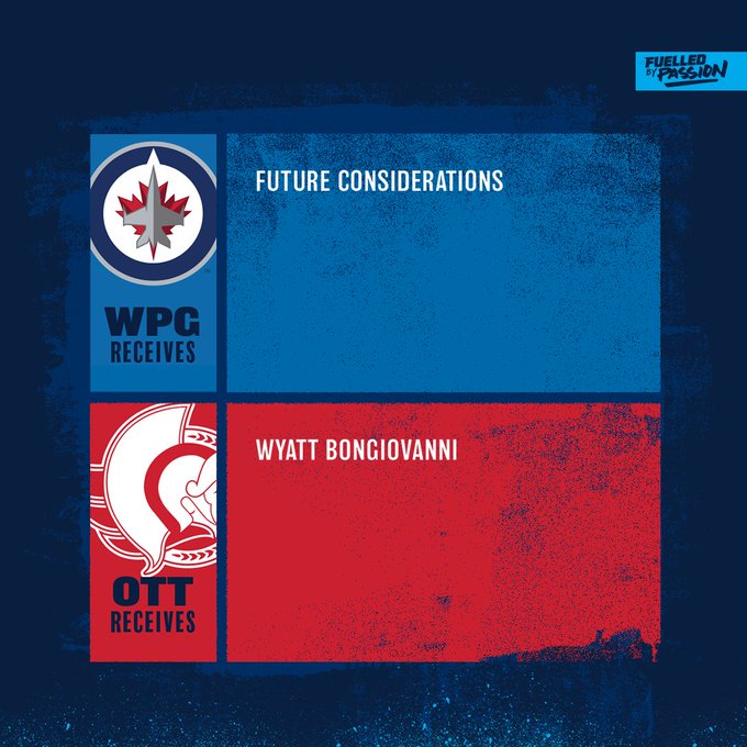 The Winnipeg Jets announced today they have traded forward Wyatt Bongiovanni to the Ottawa Senators in exchange for future considerations.