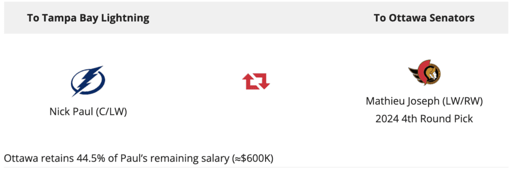 The Tampa Bay Lightning acquired forward Nick Paul from the Ottawa Senators Sunday, Daily Faceoff’s Frank Seravalli reported, in a move further loading Tampa up for the playoffs. Seravalli reported the return is forward Mathieu Joseph and a fourth-round pick.