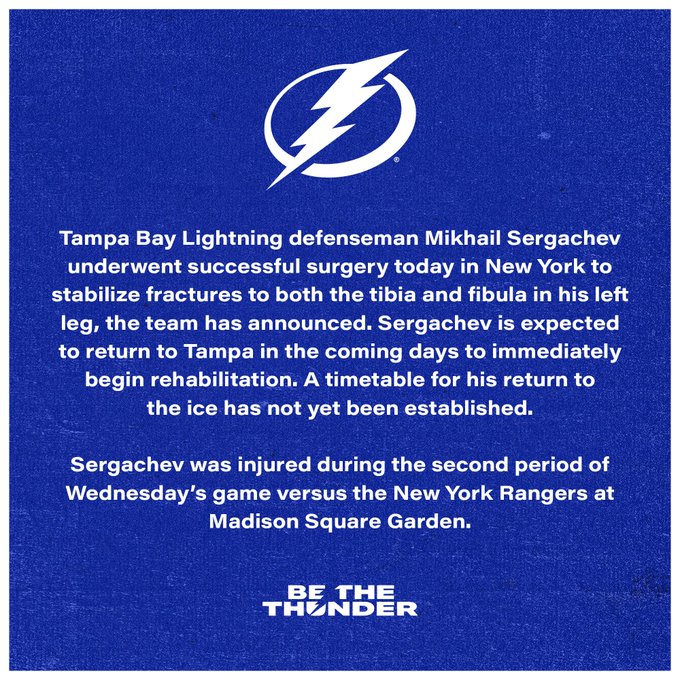 “Tampa Bay Lightning defenseman Mikhail Sergachev underwent successful surgery today in New York to stabilize fractures to both the tibia and fibula in his left leg, the team has announced. Sergachev is expected to return to Tampa in the coming days to immediately begin rehabilitation. A timetable for his return to the ice has not yet been established.“