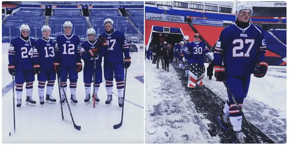 Okay, I don’t want to be too critical here because this was a pretty cool thing to do. At the 2018 World Juniors, USA and Canada played an outdoor game in Buffalo and the Americans wore football-style jerseys as a nod to the NFL’s Buffalo Bills.