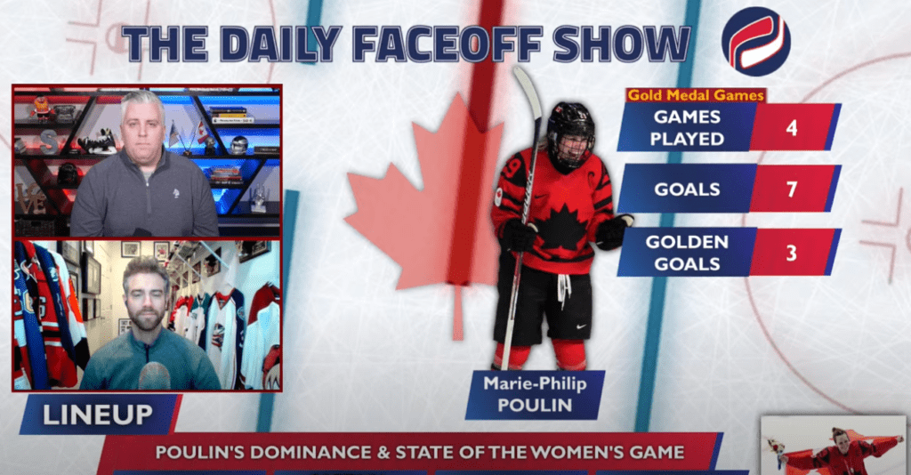 Frank Seravalli and Mike McKenna talked on Thursday’s edition of The Daily Faceoff Show about Poulin’s incredible accomplishments from gold-medal games and how women’s hockey needs to come together to capitalize on the momentum garnered from this tournament.