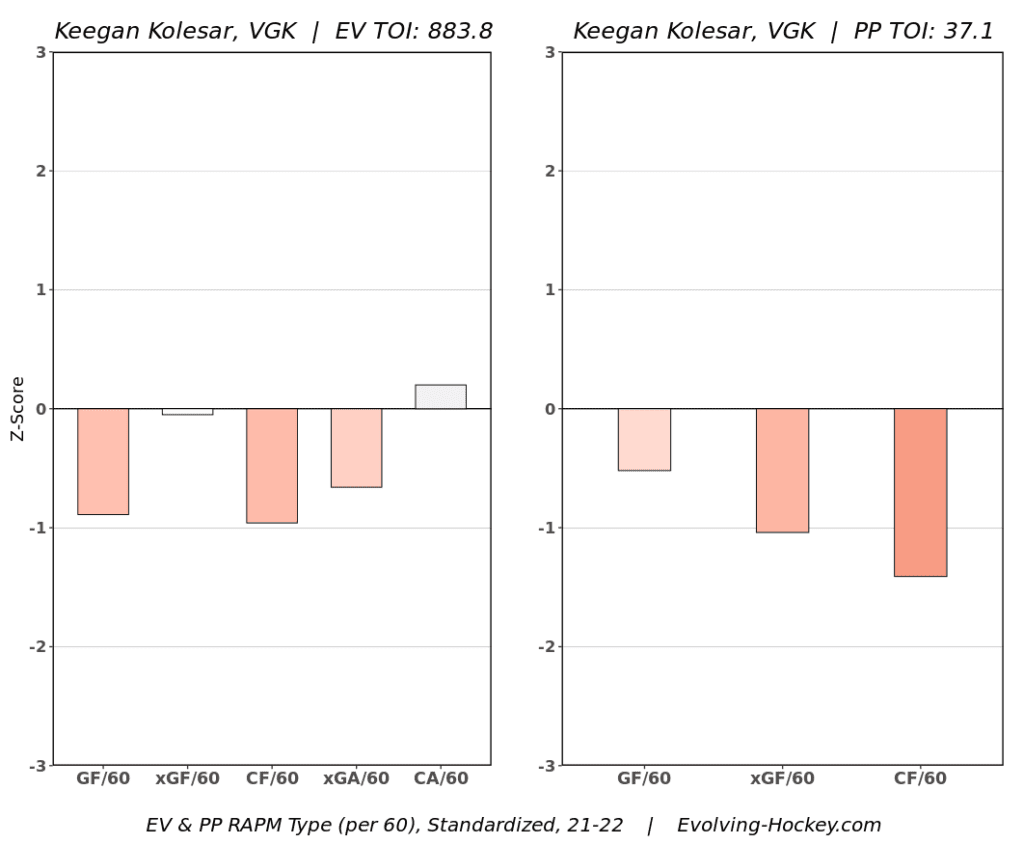 While Kolesar is more of a physical player, that doesn’t mean he can’t drive play like many players of his play style seem to be guilty of. He has a 53.57% shot attempt share and 53.36% expected goal share at even strength in his career so far, and while his regularized-adjusted plus minus indicates he’s not the one driving the bus, he certainly doesn’t slow it down either.