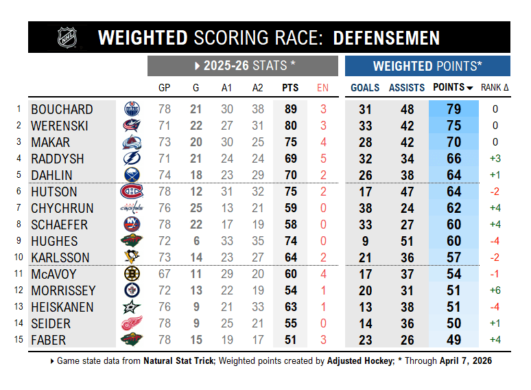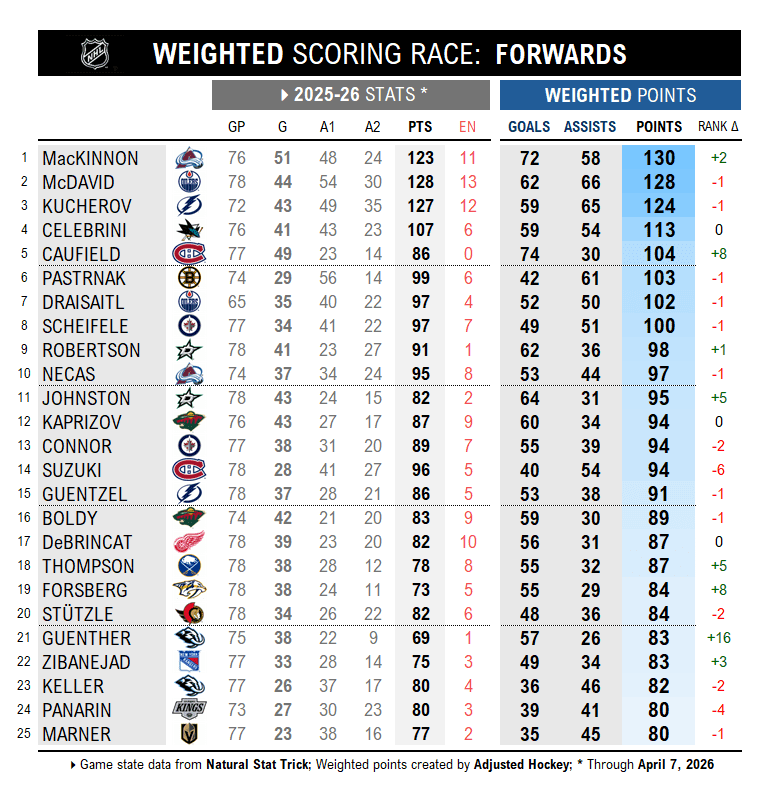 How are empty netters shaping major awards? Which players’ point totals are overrated and underrated? Who are the secondary assist and empty net merchants? Let’s find out what the 2025-26 weighted scoring race can tell us…
