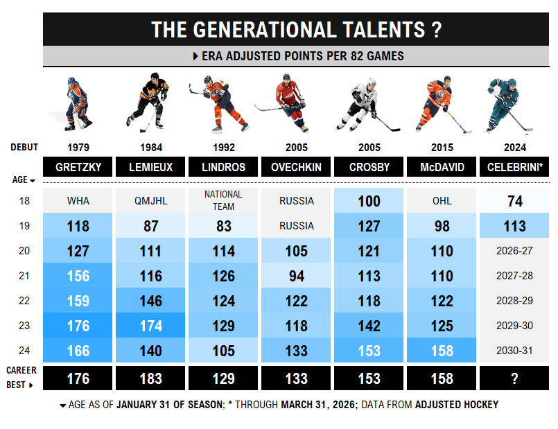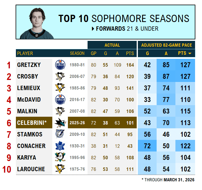 With just over two weeks left in the NHL’s regular season schedule, we’re checking in on Celebrini’s historic performance. What are his strengths and weaknesses right now? How does the Sharks’ teen idol compare to hockey’s greatest forwards after two seasons? We’ll also rank Celebrini’s 2025-26 season among the 10 best sophomore showings in league history.